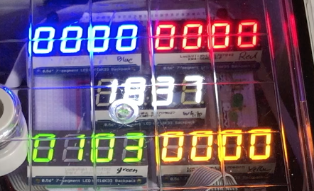 Die Flagge arbeitet mit 5x 7-Segment Anzeigen, die jeweils 4-Stellig sind. Eine Anzeige für jedes Team (in der jeweilgen Farbe) und eine für die Restspielzeit (weiß).